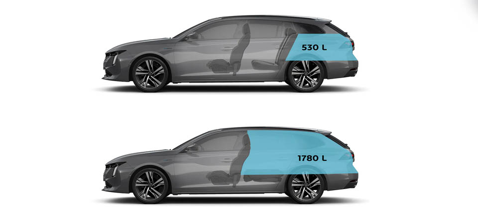 CAPACIDADE DA BAGAGEIRA DO 508 SW - A bagageira do 508 SW é grande e extremamente prática. Transforma 530 L em 1780 L com os bancos traseiros rebaixados.